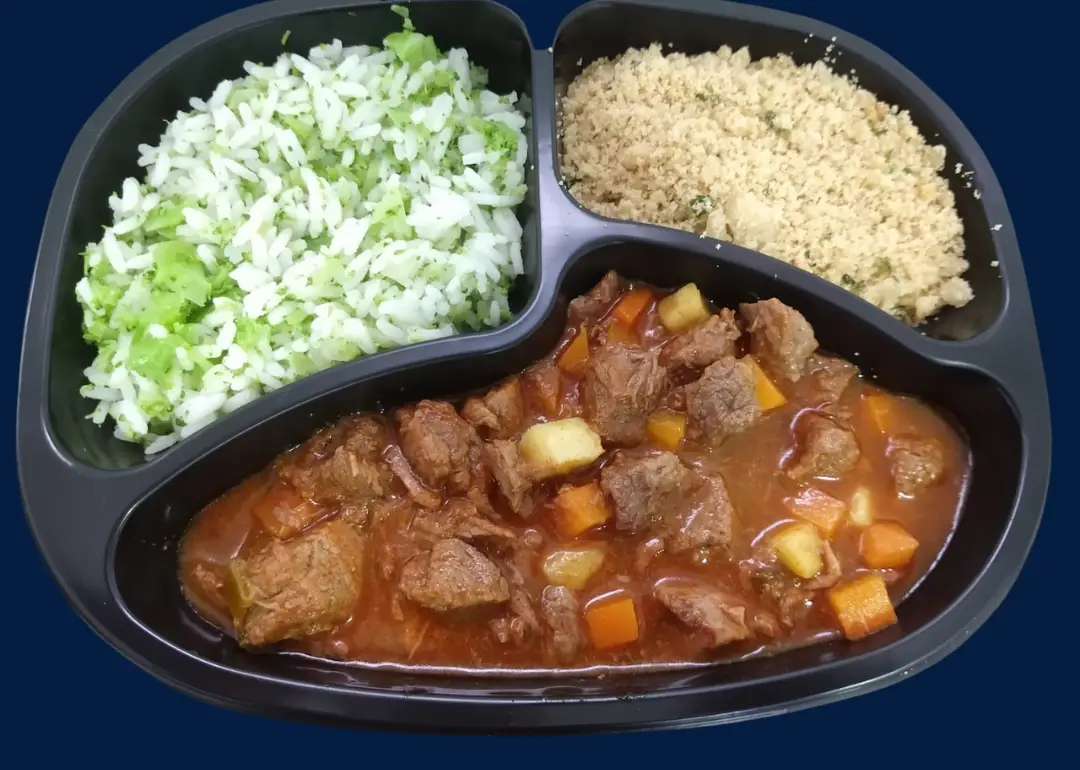 Carne bovina em cubos na cerveja pilsen com cenoura e batata doce, arroz de brócolis e farofa gourmet (com castanha do pará e amendoim)