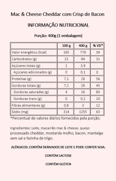 A história do Mac & Cheese remonta o século XIV, na Itália, onde o macarrão e o queijo eram ingredientes comuns na alimentação da população. No entanto, foi nos Estados Unidos, a partir de 1937, que o prato se popularizou e se tornou um símbolo. O “Mac & Cheese” no Brasil ganhou versões com diferentes tipos de queijo, como parmesão, gorgonzola e brie, além do tradicional cheddar. A nossa versão é feita com o macarrão tipo “Caracolino” com bastante molho Cheddar e finalizado com “Croutons” de Bacon.