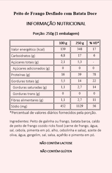 Peito de frango cozido no próprio caldo com tempero suave e cúrcuma acompanhado de batata doce assada no azeite extra virgem e salpicada com gergelim.
